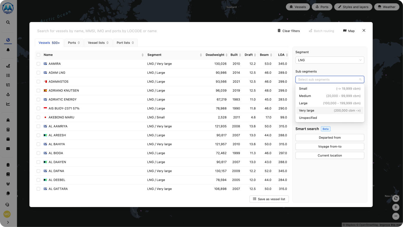 In Maritime Optima we have used the cum. sizes to divide the vessels into sub segments. In addition to the pre-defined segments, you're able to search for vessels based on your own criteria, i.e. technical details such as summer deadweight (SDTW), draft, TPC and cubic capacity to name a few. With the smart search feature you can even search for vessels based on where the vessels departed from, their current location and an entire voyage (from-to).
