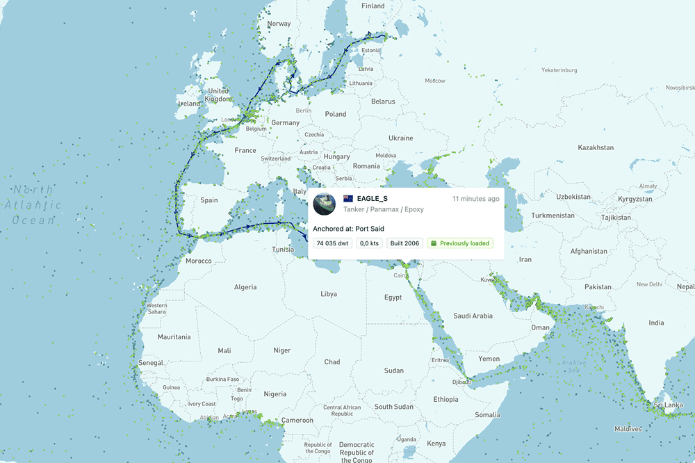 An illustration by Maritime Optima showing the route of "Eagle S" on December 25 / Time Zone: GMT / Graphics: Line Omholt-Jensen / Screenshot: ShipAtlas