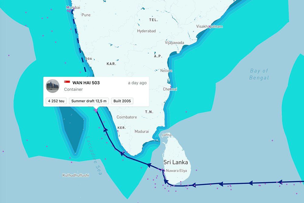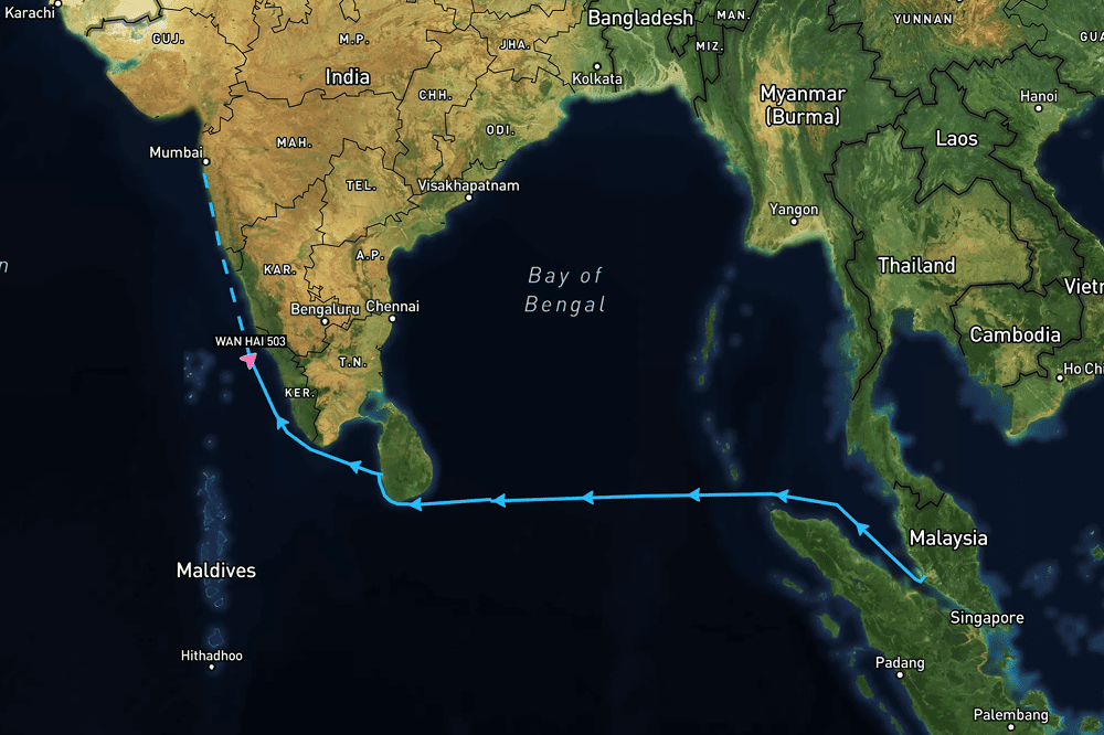 Built in 2005, the Wan Hai 503 measures 269 meters in length and 32 meters in width. The Wan Hai 503 was located approximately 78 nautical miles southwest of the Kerala region. The vessel had departed Colombo (LOCODE: LKCMB) and was en route to Mumbai (LOCODE: INBOM), where it was scheduled to arrive on June 10.