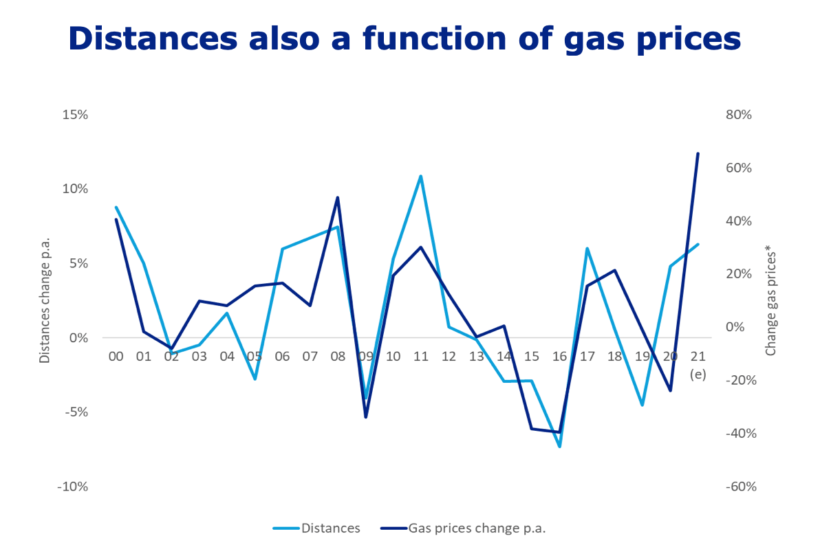At the same time new LNG liquefaction capacity will begin to rise from 2022, thus improving potential for demand growth. Speed of the fleet is already high. The same applies to average distances travelled. So, less impact on the market is expected from speed and distances. Therefore, on balance before gas prices are considered the odds for a tighter market balance seem to be higher going forward in 2022/2023.