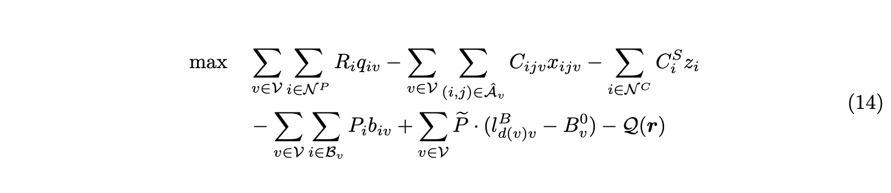 The objective function (14) aims to maximize the total profit for the deployed fleet. The first term specifies the revenue generated for both contracted and optional cargoes as a function of the quantity transported. The second term specifies the variable voyage costs associated with servicing a cargo. The final term on the first line represents the charter costs associated with servicing a contracted cargo with a spot ship. Together, the first line describes the objective presented by Christiansen (2014). The fourth term describes the cost associated with purchasing bunker, and the fifth term models the value of the bonus bunker remaining at the destination node. Note that if the bunker level at the destination is higher than at the origin, this term will positively contribute to the objective. Conversely, a lower bunker level at the destination than at the origin yields a negative contribution. The final \(\mathcal{Q}(\boldsymbol{r})\) term denotes the second-stage recourse cost for repositioning vessels to suitable regions. The symbol \(\boldsymbol{r}\) denotes the collection of \(r_{vk}\) variables stating whether a vessel \(v\)'s last visited node is located in region \(k\), or not. The \(\mathcal{Q}(\boldsymbol{r})\) term is explained further below.