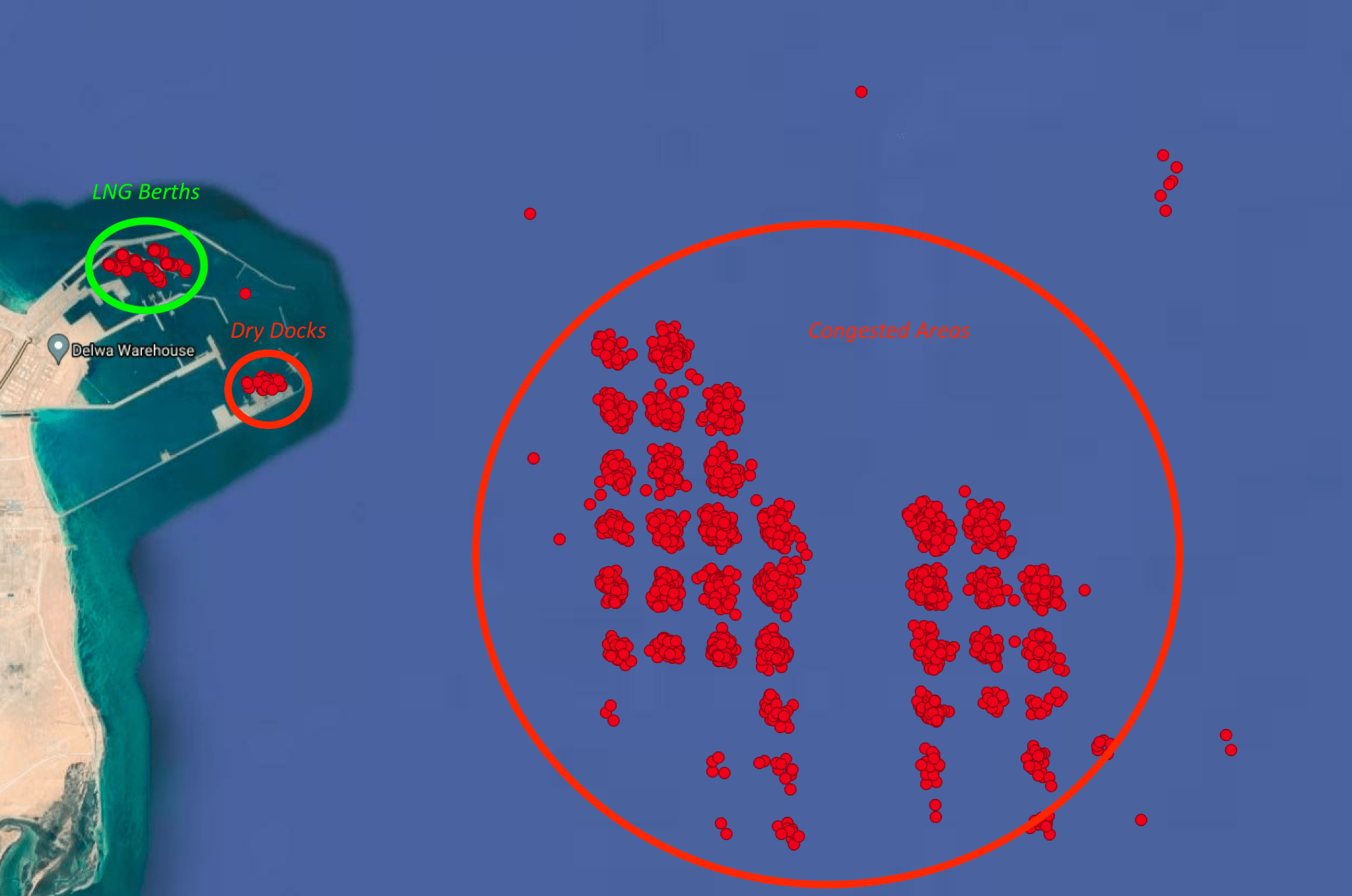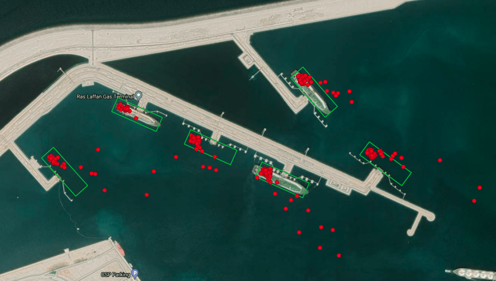 A couple of interesting observations can be made from this picture of the port of Ras Laffan in Qatar. First, the approach correctly identified the LNG berths. Second, it incorrectly identified areas of congestion as LNG berths. Third, it incorrectly identified dry docks as LNG berths.