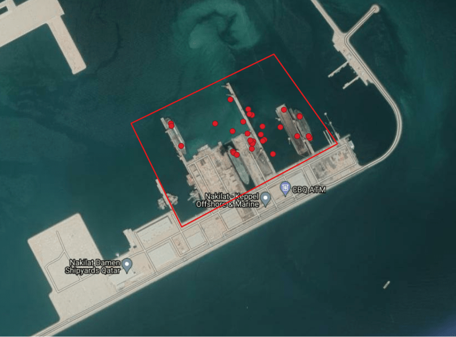 Although the above mentioned approach managed to correctly identify around 190 LNG berths, it was difficult to distinguish between areas used for ship repair such as dry docks and actual LNG berths. As there are a limited number of such places, it made sense to manually build a separate database by using tools such as QGIS. The Ras Laffan dry dock can be seen below.