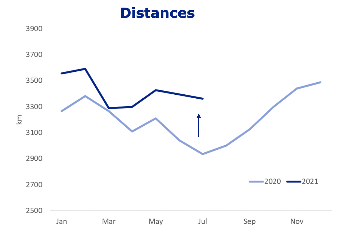 At the same time new LNG liquefaction capacity will begin to rise from 2022, thus improving potential for demand growth. Speed of the fleet is already high. The same applies to average distances travelled. So, less impact on the market is expected from speed and distances. Therefore, on balance before gas prices are considered the odds for a tighter market balance seem to be higher going forward in 2022/2023.