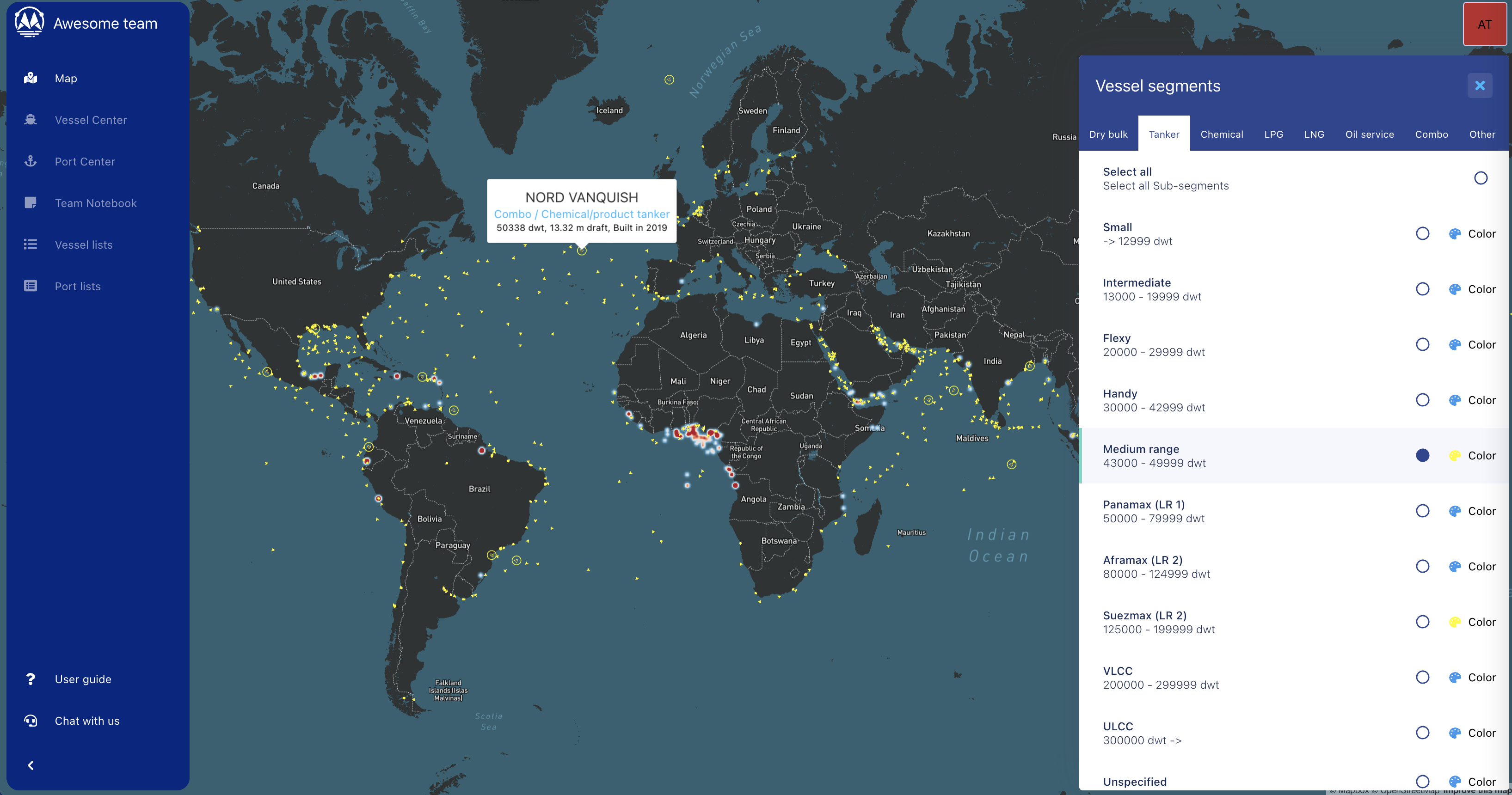 If you are working with MR tanker vessels you can add the "MR tanker sub-segment" to your map and create and add lists of your vessels. If you hover over the vessels, you will find information about their positions, last time we have observed them, where they are heading and technical information.