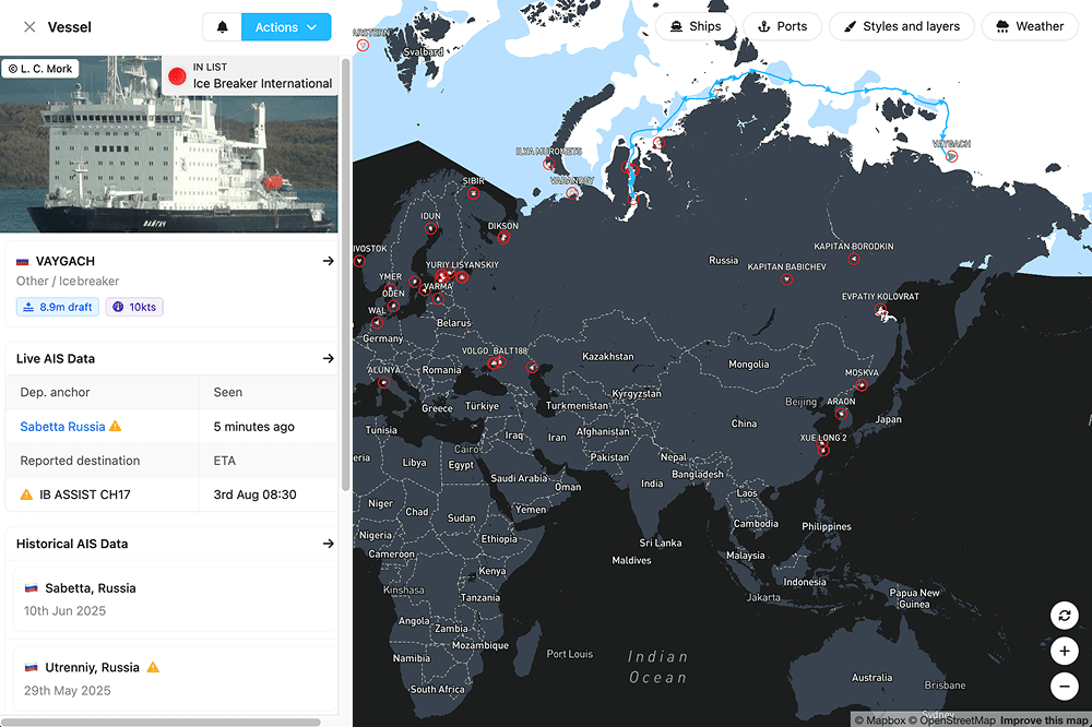 Track icebreaker vessels and Arctic traffic in real-time with ShipAtlas by Maritime Optima / Graphic: Line Omholt-Jensen / Screenshot: ShipAtlas